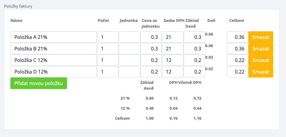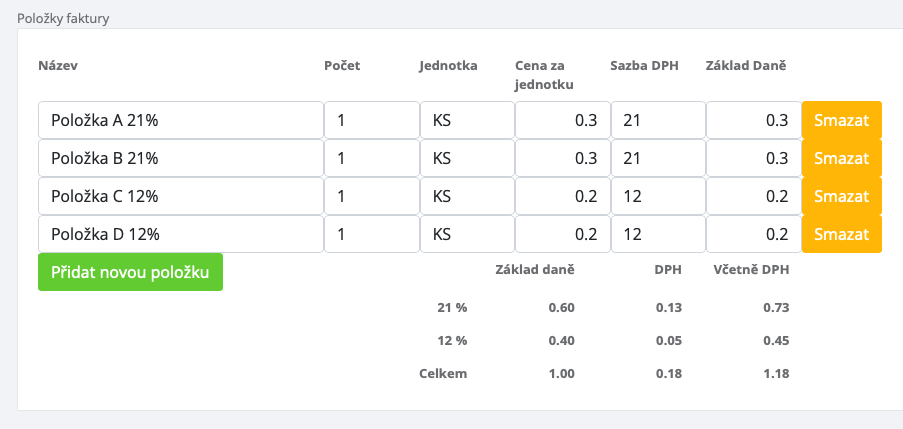 Celková cena s DPH pak jako suma celkové DPH a celkového základu daně.
